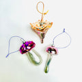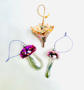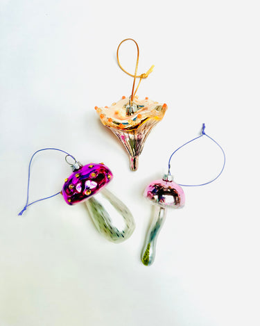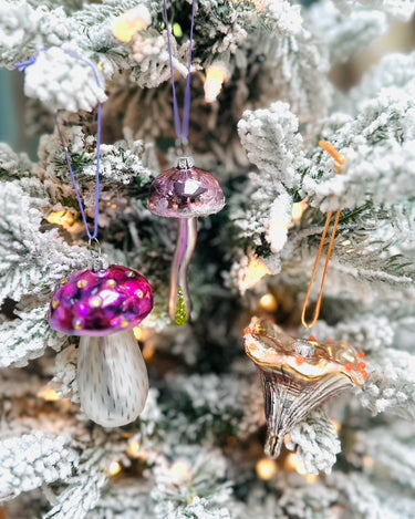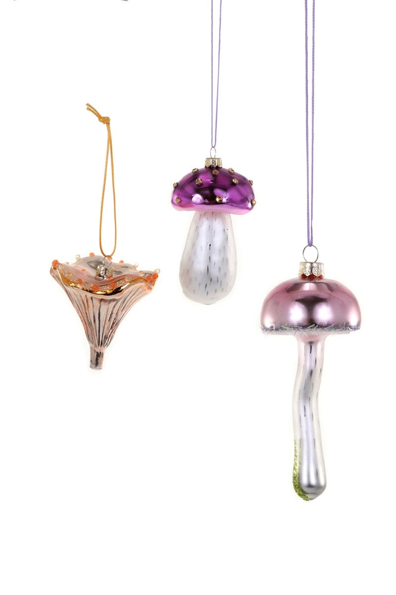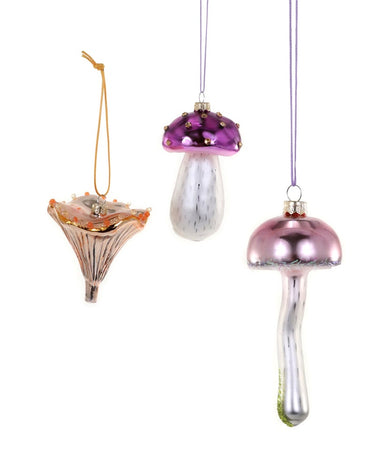 A woodland trio: a golden chanterelle, a slender‑stem beauty, and a plump classic toadstool—assorted in soft pastels with glitter accents. A fairy‑tale forest floor for your branches.