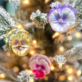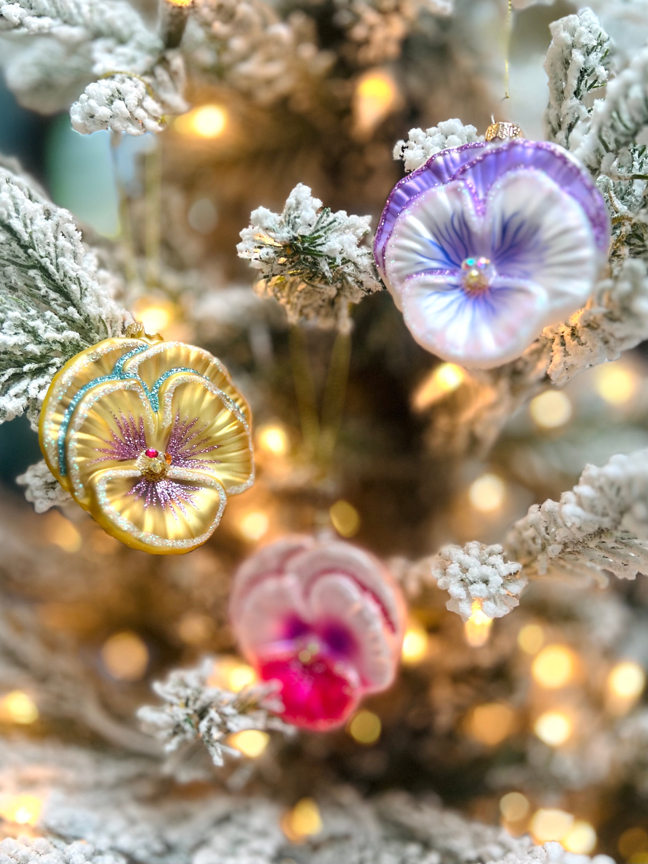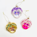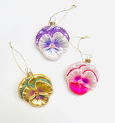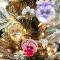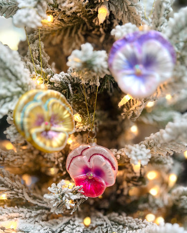 Three stunning assorted pansies — gold, pink, and purple — each hand-painted with shimmering glitter and soft color variations. Detailed and realistic, these little blooms bring a burst of garden beauty to your tree.