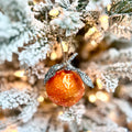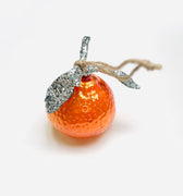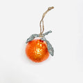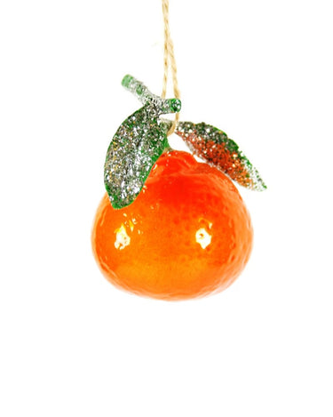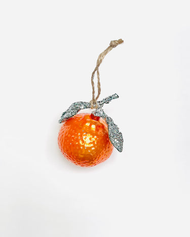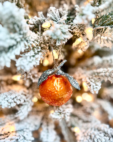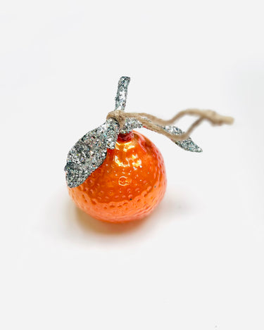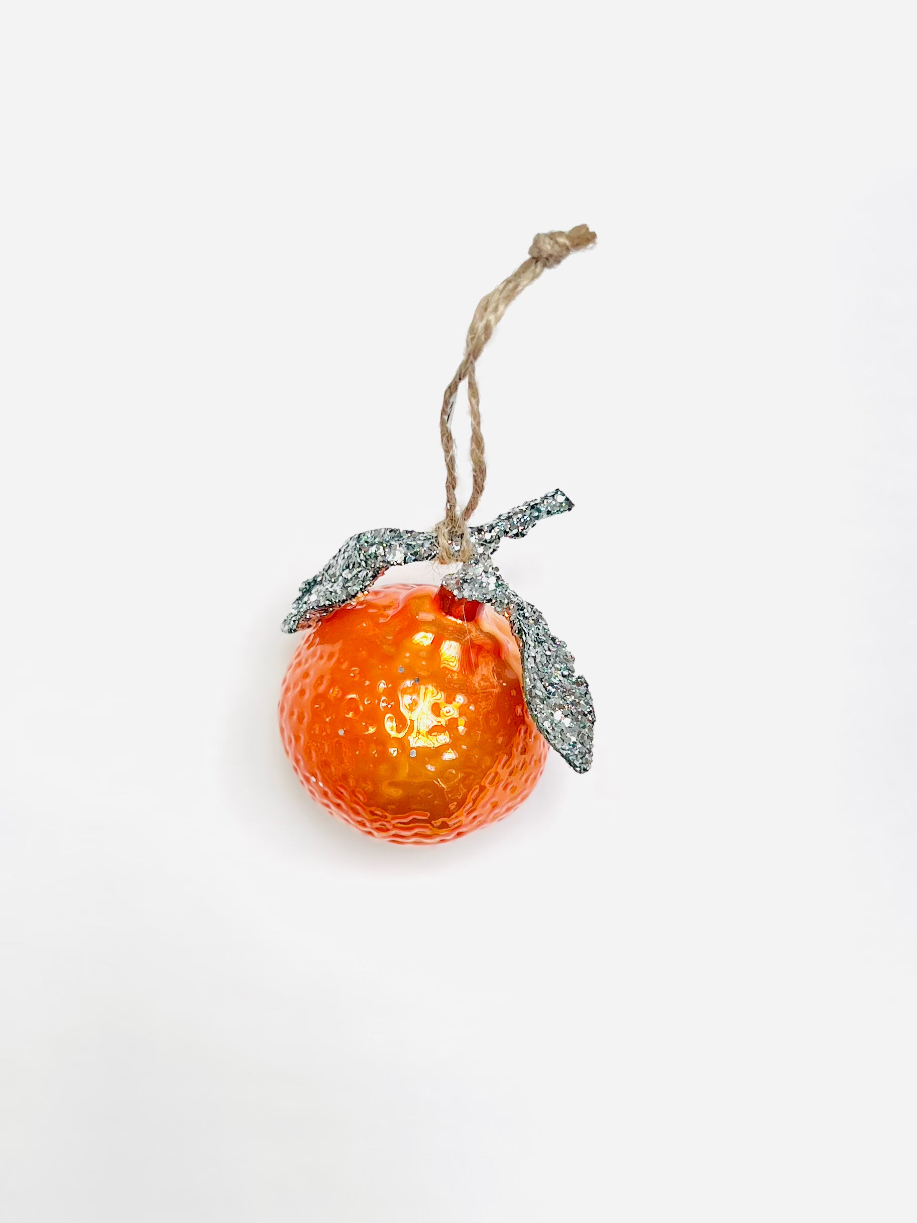 A tiny burst of brightness for your tree, this glossy tangerine ornament captures the cheer of winter citrus. Its vibrant orange peel shines, finished with glitter-dusted green leaves and a stem for just the right touch of sparkle. Pairs beautifully with our pomegranate and fig ornaments for a full fruit-bowl moment.