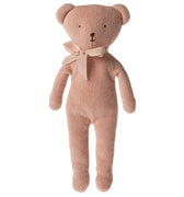 Available in soft hues like rose and blue, each bear is finished with a delicate ribbon bow at the neck and a gentle expression that makes them easy to adore.