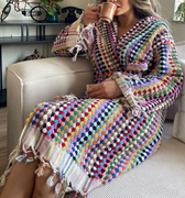 Designed for effortless comfort, this unisex robe features two roomy pockets, a cozy hood, and delicate tassel details along the sleeves, pockets, and hem. Light yet durable, it’s perfect for layering at home, after a bath, or as a stylish cover-up.